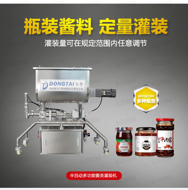 辣椒醬灌裝機(jī) 適合于將各類(lèi)粘稠體及含有各種固體物質(zhì)如辣椒、花生、肉塊、佐料等物體的醬類(lèi)和油、料分離的火鍋底料等灌裝于各種容器中,辣椒醬灌裝機(jī) 適用于辣椒醬、顆粒醬料、大塊肉醬、火鍋底料等的灌裝。辣椒醬灌裝機(jī) /半自動(dòng)辣椒醬灌裝機(jī)可灌裝顆粒漿狀流體物料,特別適用于調(diào)味品中帶顆粒并且濃度較大的辣椒醬、火鍋底料等粘稠醬類(lèi)的灌裝,配置的自動(dòng)攪拌器,辣椒醬灌裝機(jī) 保證了醬和油的充分混合,又稱(chēng)為辣椒醬灌裝機(jī)、花生醬灌裝機(jī)、豆瓣醬灌裝機(jī)、果醬灌裝機(jī),芝麻醬灌裝機(jī)、粘稠醬類(lèi)灌裝機(jī)、牛肉醬灌裝機(jī)。