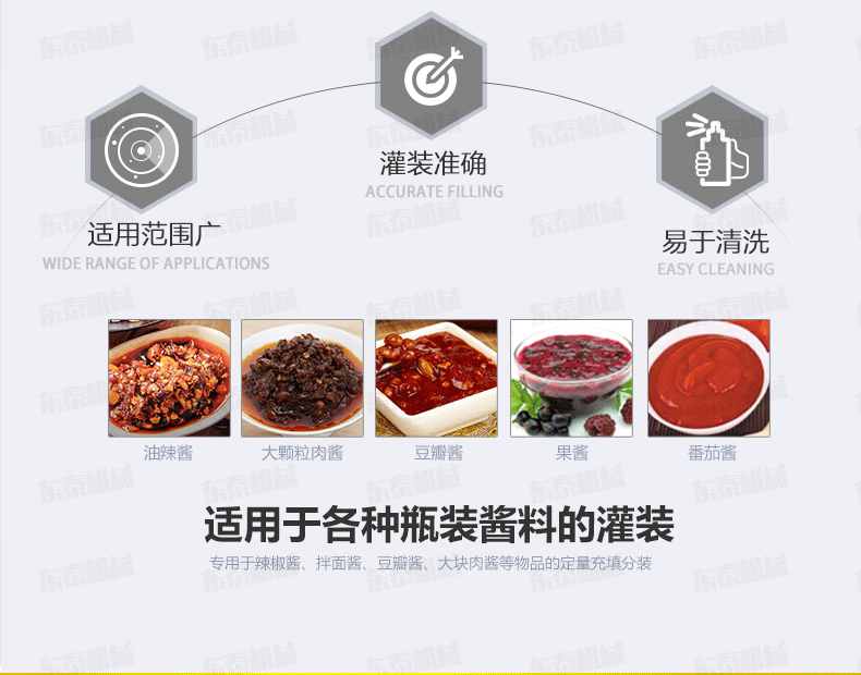 4、顆粒醬定量灌裝機(jī)主要針對(duì)食品行業(yè)的醬類(lèi)分裝設(shè)計(jì)生產(chǎn),香菇醬灌裝機(jī)特別適用于調(diào)味品中帶顆粒并且濃度較大的辣椒醬、豆瓣醬、花生醬、芝麻醬、果醬、牛油火鍋底料、紅油火鍋底料等物質(zhì)的粘稠醬類(lèi)的灌裝;