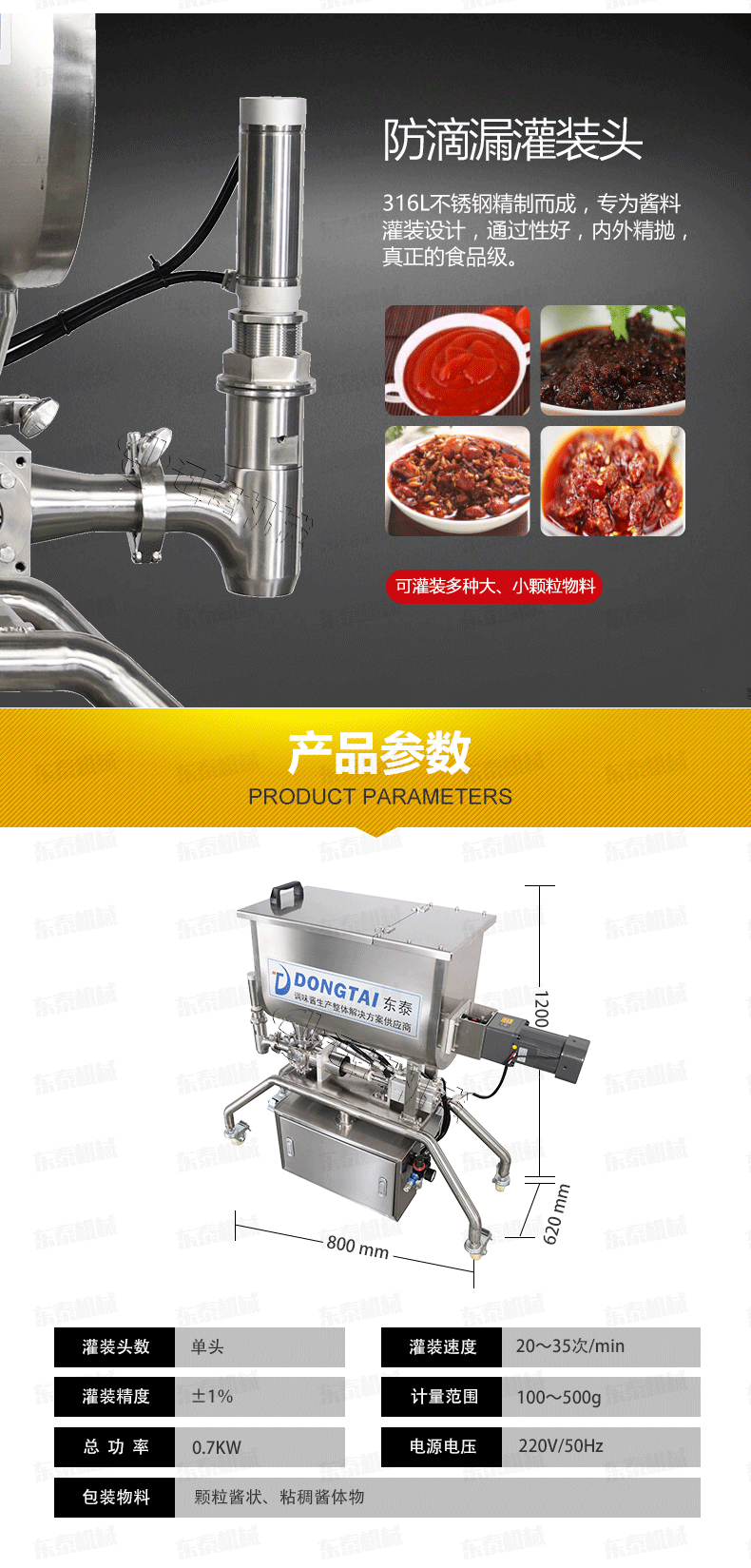 隨著機(jī)械化時(shí)代的到來(lái),讓我們的生活進(jìn)入智能化的時(shí)代,近年來(lái)醬行業(yè)的快速發(fā)展擴(kuò)大了辣椒醬灌裝機(jī) 的市場(chǎng)需求,進(jìn)一步提高了辣椒醬灌裝機(jī) 的生產(chǎn)效率和自動(dòng)化的加強(qiáng),企業(yè)對(duì)醬灌裝的灌裝物料完整性要求越來(lái)越高,因此,東泰機(jī)械對(duì)顆粒醬灌裝物料完整性進(jìn)行了調(diào)試和調(diào)整,我們今天一起看一下這款大顆粒醬都可以灌裝的辣椒醬灌裝機(jī)到底有什么優(yōu)勢(shì)?