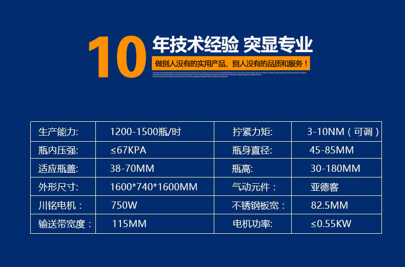 該直線式真空旋蓋機是東泰機械結合用戶使用情況,摒棄了傳統(tǒng)轉盤式真空旋蓋機的弊端,研制開發(fā)的新型高效設備,設備自動檢測到兩個瓶子蓋子進入到雙頭真空旋蓋機內,旋蓋機彩色顯示屏會實時顯示旋蓋狀況,整機多點檢測,當進口無瓶無蓋、出口堵塞、定位不準、瓶身傾倒均自動停機。單個旋蓋頭達到的真空度都可以單獨顯示,單獨調整。合格
