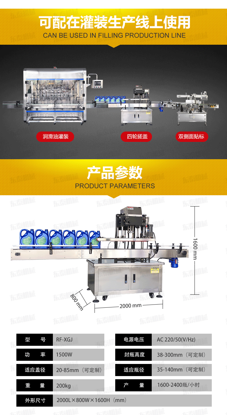 機油自動搓蓋機電氣控制運動,穩(wěn)定性強; 設(shè)有定位裝置,旋蓋標(biāo)準(zhǔn),操作方便; 鎖蓋范圍寬,可鎖不同形狀規(guī)格的瓶蓋;解決了噴頭、泵頭、噴霧泵、手扣式噴頭旋蓋難的
