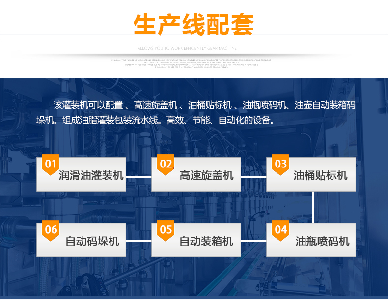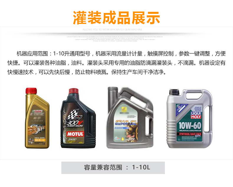 該大型潤(rùn)滑油灌裝機(jī)采用容積式計(jì)量灌裝原理,適用于各種規(guī)格(1-5L)的液體肥等液體灌裝。設(shè)備采用伺服驅(qū)動(dòng)活塞計(jì)量,保證了 1‰的灌裝,在保證灌裝的同時(shí),提高了 20%-35%的灌裝速度,操作簡(jiǎn)單,維護(hù)方便,節(jié)省人工成本,生產(chǎn)效率更高。
