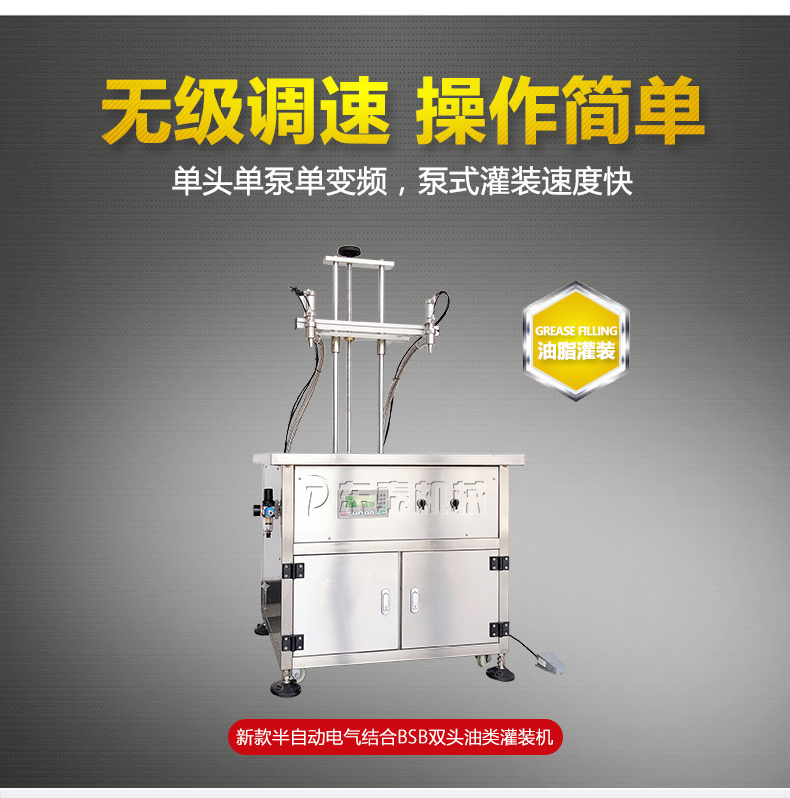 半自動(dòng)雙頭食用油灌裝機(jī)主要是應(yīng)用于各種食用油、潤(rùn)滑油等粘稠液體的定量灌裝,如花生油,大豆油,菜籽油、香油,潤(rùn)滑油等油類(lèi)的灌裝。還擁有這先進(jìn)的定量灌裝技術(shù),結(jié)合了微電子智能控制技術(shù)有著單頭單變頻控制系統(tǒng),實(shí)現(xiàn)高精度、無(wú)級(jí)調(diào)速,操作方便。兩個(gè)灌裝頭能夠在一定的范圍內(nèi)隨意調(diào)節(jié)間距和灌裝量,能夠使用多種大小形狀的容器的灌裝。自動(dòng)化程度高。另外,半自動(dòng)雙頭食用油灌裝機(jī)的機(jī)身零件選用的事優(yōu)質(zhì)不銹鋼,耐用又衛(wèi)生,長(zhǎng)時(shí)間工作性能可靠穩(wěn)定。本公司產(chǎn)品通過(guò)了IS9000質(zhì)量體系認(rèn)證。設(shè)備經(jīng)久耐用,性能穩(wěn)定,是食用油、潤(rùn)滑油等行業(yè)理想的灌裝設(shè)備。
